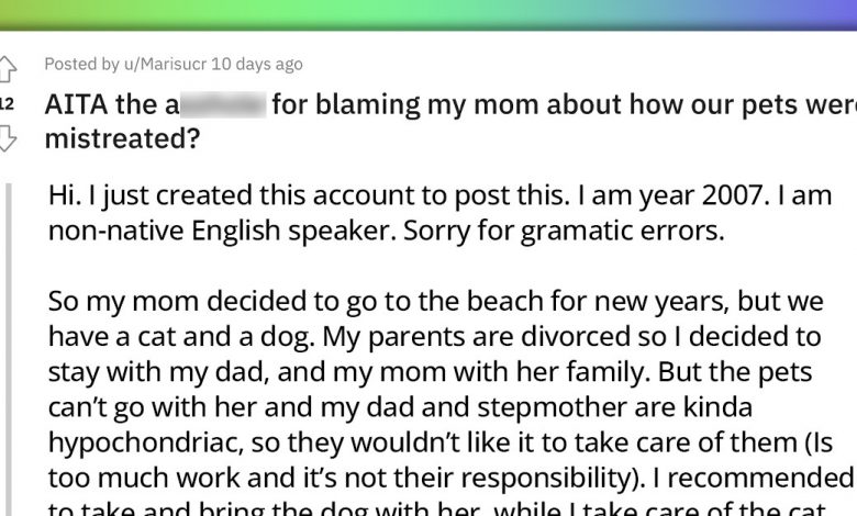 In the following account, OP’s mother embarked on a New Year’s beach trip, accompanied by a feline and canine companion. Given her parents’ separation, OP chose to spend the holiday with her father. However, due to their unwillingness to undertake the responsibility, her father and stepmother declined to care for the pets.