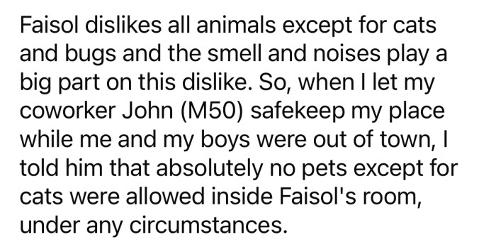 OP’s son has a specific preference when it comes to animals in his room – he only allows cats.