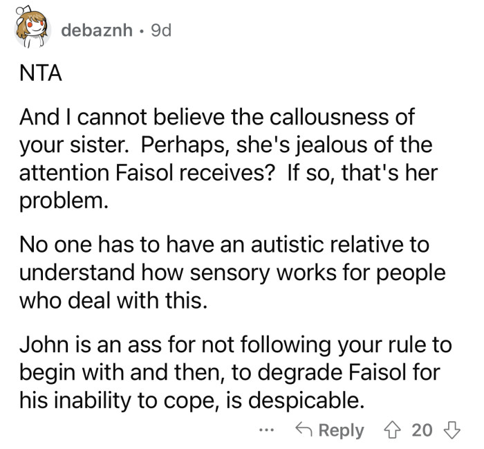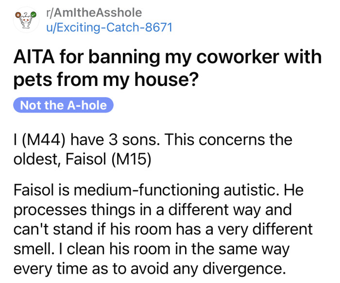 A Redditor using the handle u/Exciting-Catch-8671 shared their experience on the r/AmItheAhole subreddit, explaining their decision to bar their coworker from their home due to a breach of house rules that caused considerable distress for their autistic son. This Redditor’s sister offered an opposing viewpoint, causing doubts about their handling of the situation and prompting them to seek guidance from the Reddit community.