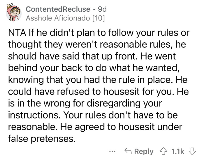 “Reasonable rules aren’t mandatory. He agreed to housesit under false pretenses.”