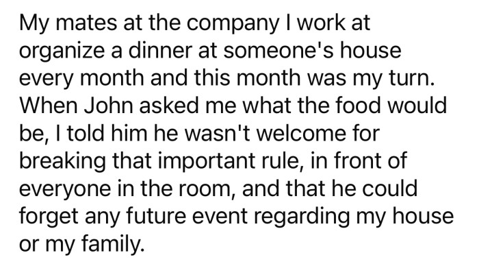 When John, the coworker, inquired about meal plans, OP informed him that he was unwelcome in their home.