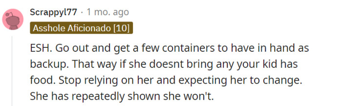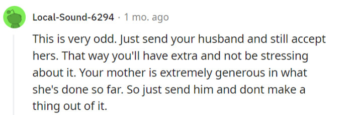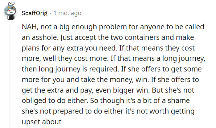 Despite ongoing frustrations, OP acknowledges and appreciates their mother’s consistent efforts to deliver the requested two containers. Nevertheless, they remain perplexed by their mother’s resistance to acquiring four containers, even with OP’s willingness to contribute financially, thereby resolving the recurring ordeal.