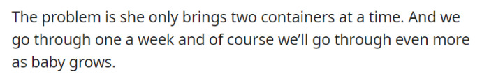 Despite OP’s gratitude for their mother’s initiative in purchasing baby formula, a fresh challenge arises as she brings home only two containers at a time. With the family consuming one container per week and an expected increase in consumption as the baby grows, the necessity for a more substantial supply becomes evident.