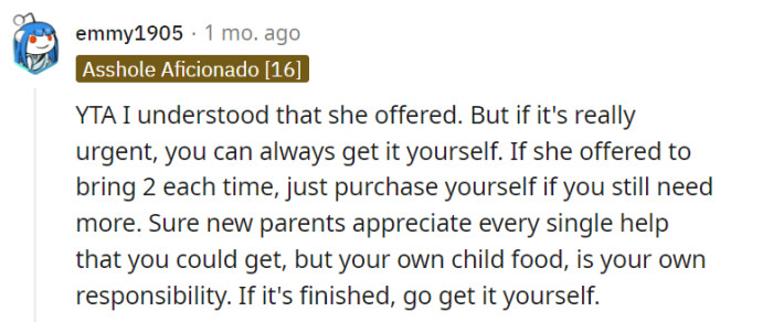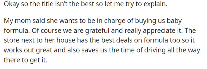 In a heartwarming demonstration of support, OP’s mother takes on the responsibility of procuring baby formula for the family, a gesture that is deeply appreciated. The added convenience of a nearby store offering optimal deals on formula proves to be a time-saving boon, sparing them the need for long travels to obtain this essential commodity.