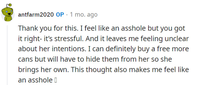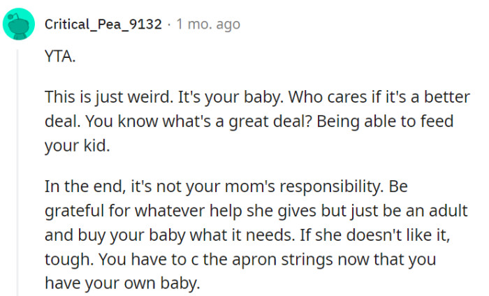 OP candidly conveyed their feelings to their mother, highlighting the stress arising from her recurrent surprise at their formula depletion. They expressed the discomfort of repeatedly seeking assistance, only to receive hesitant responses despite the initial offer. Emphasis was placed on the gravity of the situation, concerning their baby’s fundamental nutritional needs.