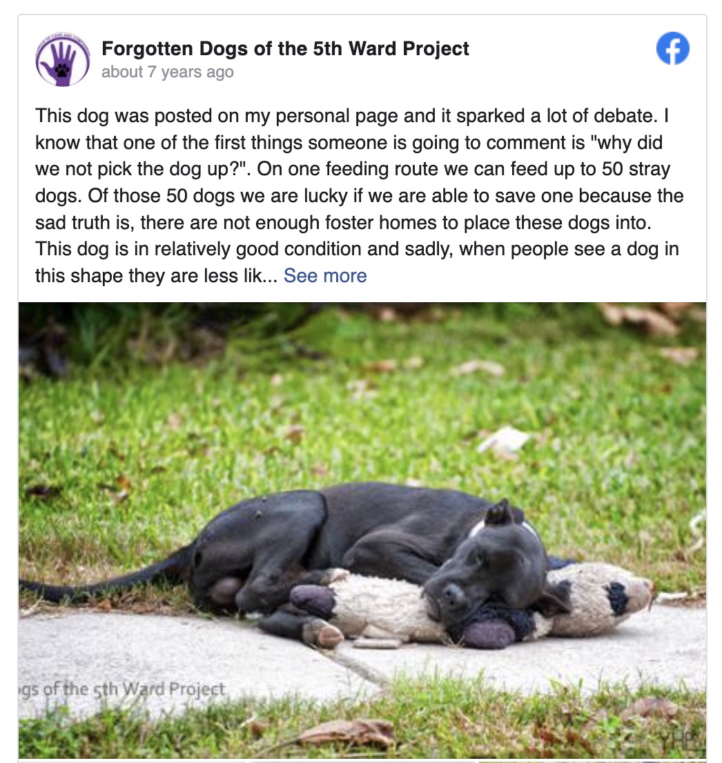 “On one feeding route, we may provide food for up to 50 stray dogs. “Of those 50 dogs, we are lucky if we are able to save one,” she said on the website for Forgotten Dogs of the 5th Ward. “The sad fact is, there are not enough foster homes to put these dogs into.”