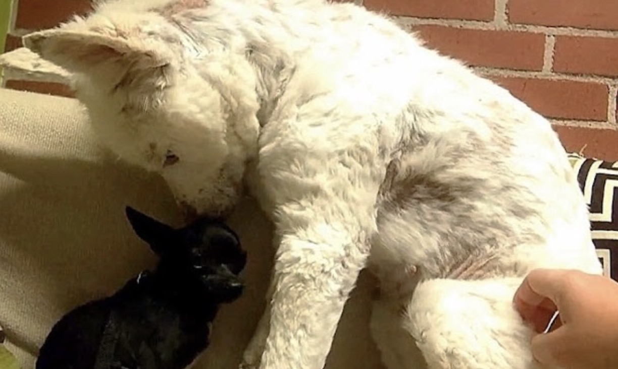 The crew presented Miley to Frankie, a Chihuahua they had just pulled from a sewer when her recuperation struck a snag.