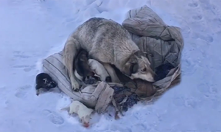 A tragic tale is being played out in front of us. Under the chilly snow, the mother dog gave birth to ten puppies.