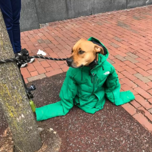 Hollie said:” It was very cold and windy out. I noticed that he was visibly shaking. She obviously noticed too because she immediately took off her jacket and covered the dog as he sat. Maybe she thought he would kick it off, so she bent down and zipped it up around him!” The dog sat completely still as his mom put her jacket around him, so excited to wear something cozy. It was clear that the woman would have taken her dog inside with her if she could and since she couldn’t, she wanted to make sure he was as comfortable as possible until she got back, even if she was only gone for a few minutes.
