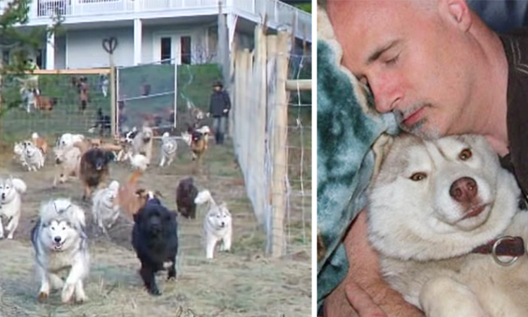 This man ultimately adopted 45 pets (and a grey wolf). 45 dogs—yes, you read that right. He takes great care of them all and welcomes them all into his house.