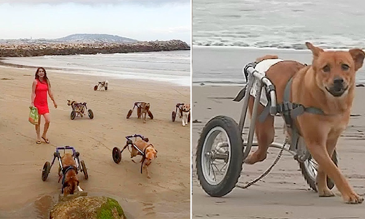 The dogs raced Salima from one end of the beach to the other despite having only their front legs functional.