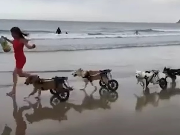 The dogs raced Salima from one end of the beach to the other despite having only their front legs functional.