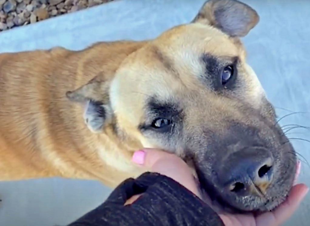 Woman wakes up to find stray dog sitting on her porch, helps him find a new home