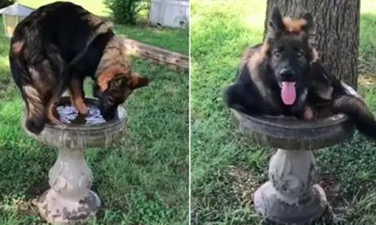 Even though he’s a sturdy German boi, Kai likes to jump on the birdbath on hot summer days and just casually drink water from it.