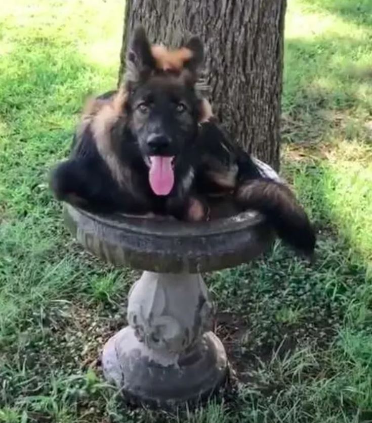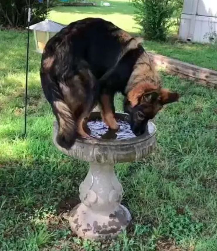 Even though he’s a sturdy German boi, Kai likes to jump on the birdbath on hot summer days and just casually drink water from it.