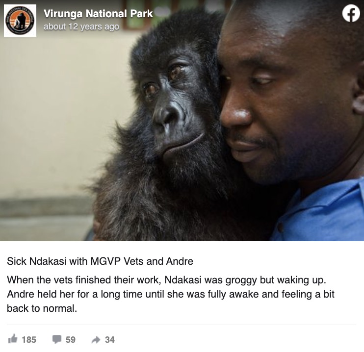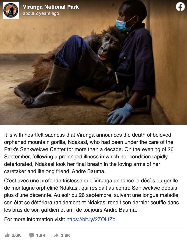 According to the park, “Ndakasi took her last breath in the loving arms of her caregiver and lifelong friend, Andre Bauma.”