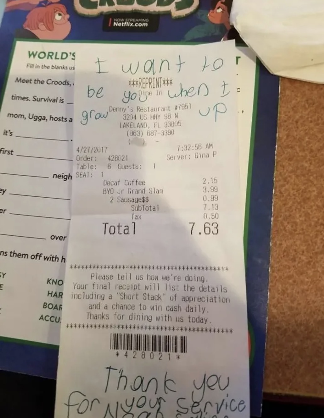His mother Amanda waved over the waitress and told her about the plan. After they paid Eddie’s bill, Noah wrote down a message on the receipt.