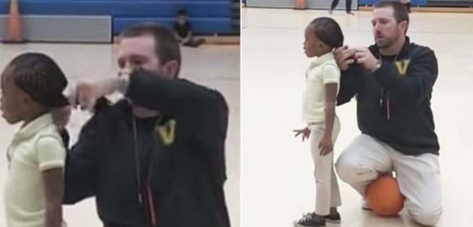The coach went into action when Kristen Paulk, a kindergartener on Oliver’s basketball team, begged him to assist her in putting her hair back in a ponytail.