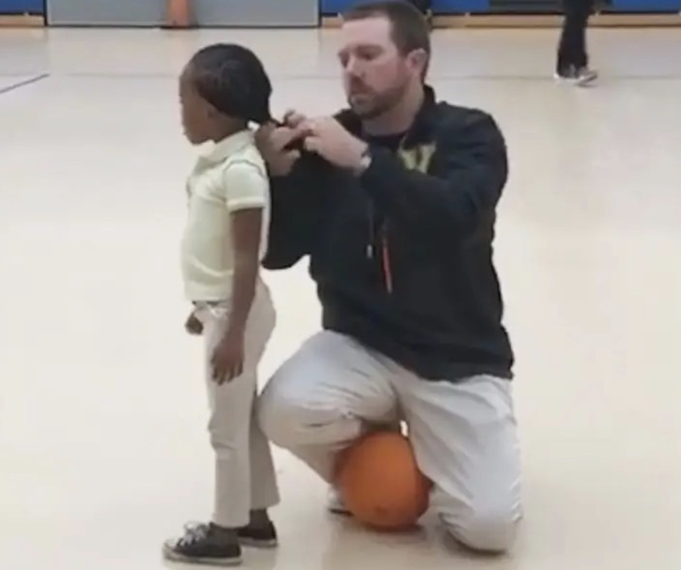 The coach went into action when Kristen Paulk, a kindergartener on Oliver’s basketball team, begged him to assist her in putting her hair back in a ponytail.