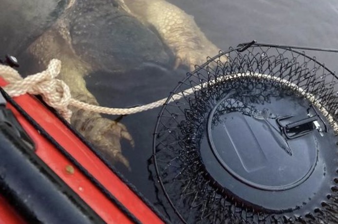 The photograph reveals the turtle’s massive claws stretching towards a net full of fish, with its colossal, Godzilla-like head at the forefront. It’s evident from the image that this turtle is much larger than most of its kind.