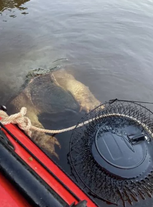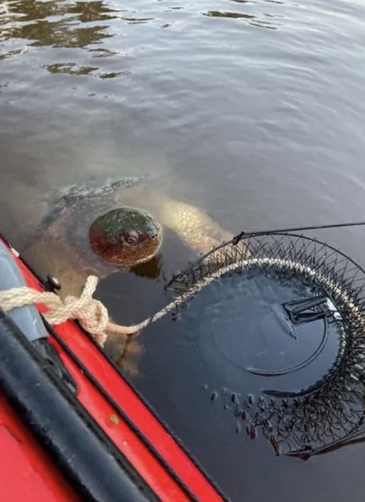 The photograph reveals the turtle’s massive claws stretching towards a net full of fish, with its colossal, Godzilla-like head at the forefront. It’s evident from the image that this turtle is much larger than most of its kind.