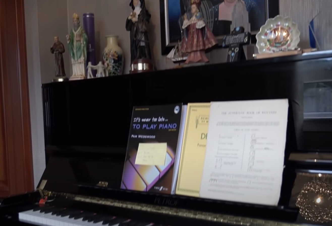 She laughed about the state of her piano room and revealed that she had recently begun playing the instrument.