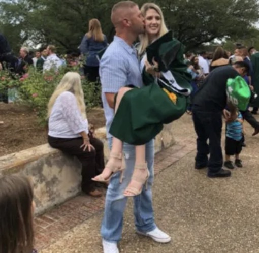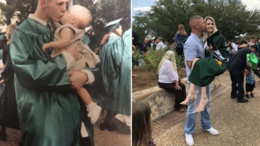 When Dennis graduated high school in 2000, he was lucky enough to have his infant daughter, Tori, present for the celebrations. At the time, the pair posed for a photo in which Dennis gave his little girl a kiss – the perfect keepsake reminder of his big day.