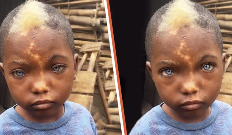 A little African boy with striking features has gone viral on the internet. People are captivated by his natural blue eyes, a lightning-shaped scar on his face, and a patch of white hair, which some describe as “angelic.” Despite not knowing his name or age, his remarkable appearance has garnered worldwide attention.