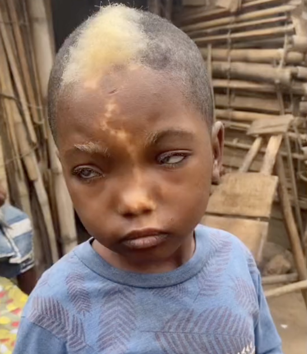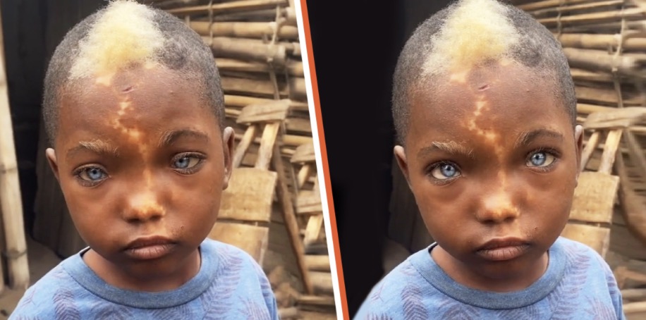 A little African boy with striking features has gone viral on the internet. People are captivated by his natural blue eyes, a lightning-shaped scar on his face, and a patch of white hair, which some describe as “angelic.” Despite not knowing his name or age, his remarkable appearance has garnered worldwide attention.