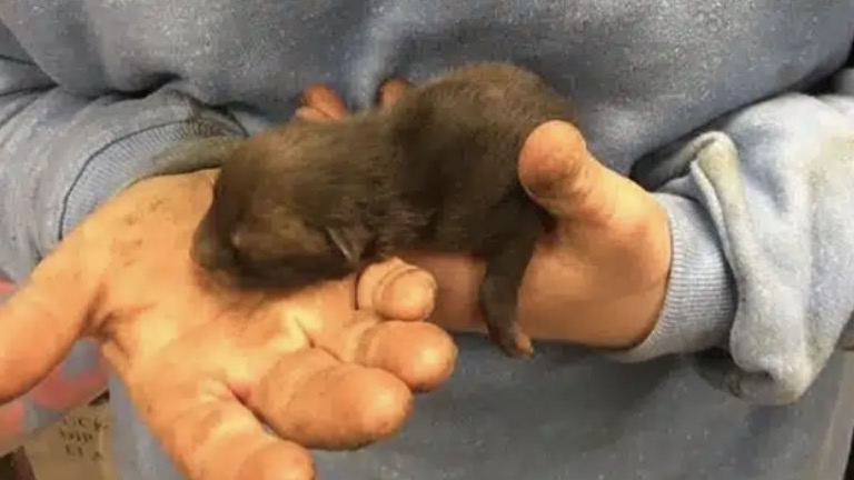 As he lifted an old mattress to dispose of it, he found what he thought were five little puppies or kittens lying underneath it.