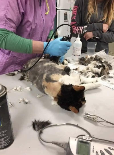 She was discovered by Paul Russell, who exclaimed, “My god, this is a cat!” Hidey, a 14-year-old cat, was saved by an animal-loving couple and taken to the Animal Rescue League Shelter & Wildlife Center.