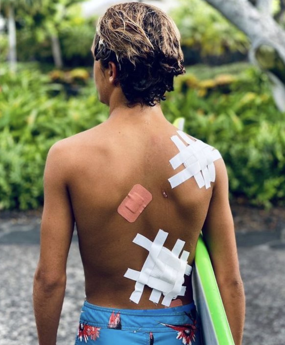 In the photo, 14-year-old Levi stands confidently beside his bright neon green surfboard. He proudly displays large white bandages on his sun-kissed skin, with a small pink plaster standing out in the center of his back. Despite the injuries, Matthew, known for his relaxed nature, brushes them off with a lighthearted comment.