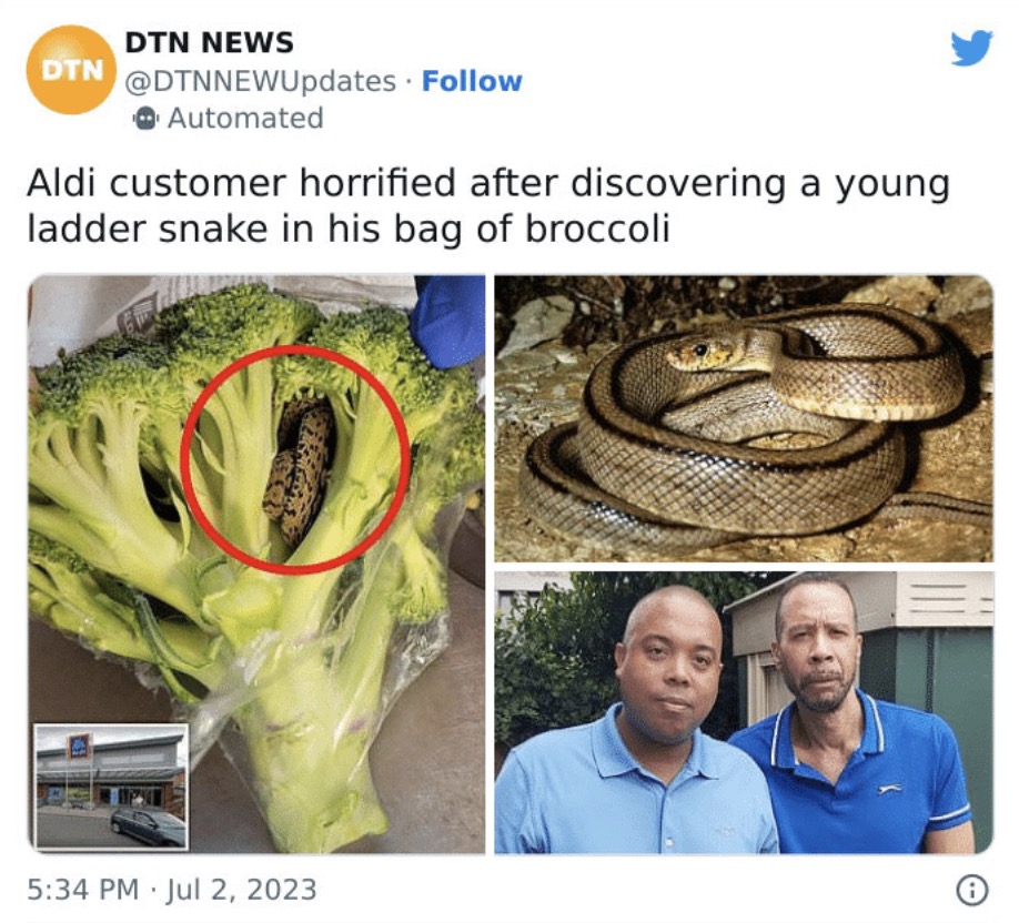 However, herpetologist Dr. Steven J. R. Allain disagreed with the identification, suggesting that the snake was a viperine water snake, which is also non-dangerous to humans. He explained that these snakes do not bite humans as a defense mechanism and are considered non-venomous. He theorized that the snake likely ended up in the broccoli due to agricultural equipment scooping it up while it was moving through a field.