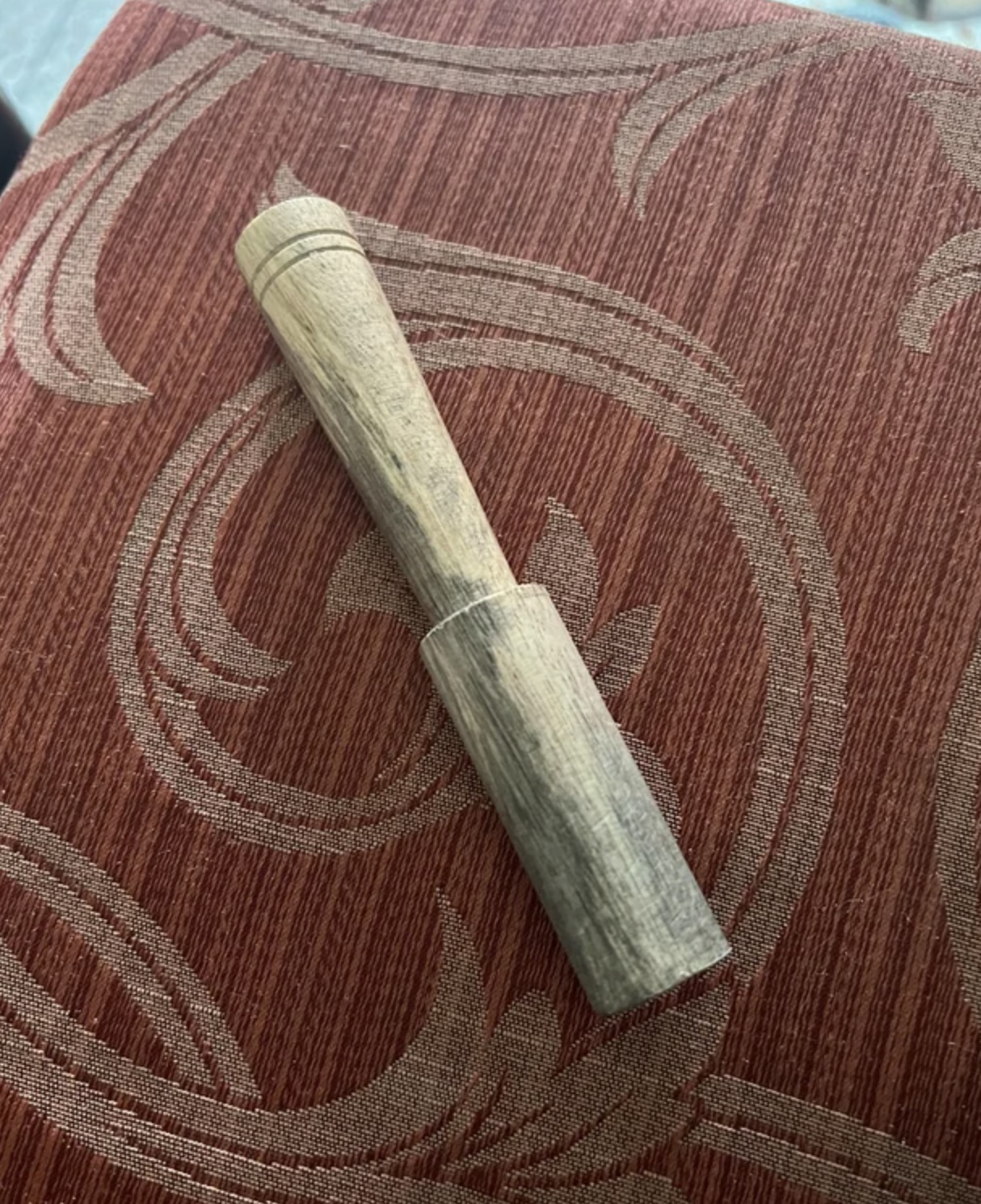 Answer: The wooden stick was likely used with a Singing Bell to make vibrations. According to the commenter, rubbing the cylindrical wood around its edge would make the bell vibrate, similar to a wine glass.