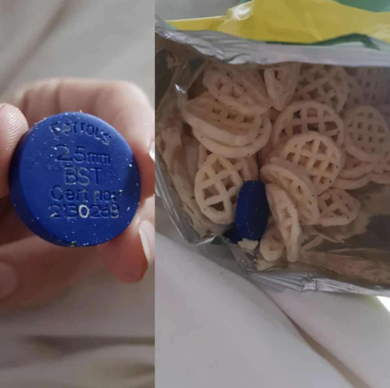 One Reddit user found a small blue disc inside a bag of crisps with the inscription “ferrous 25mm BST, cert number 213026B.”