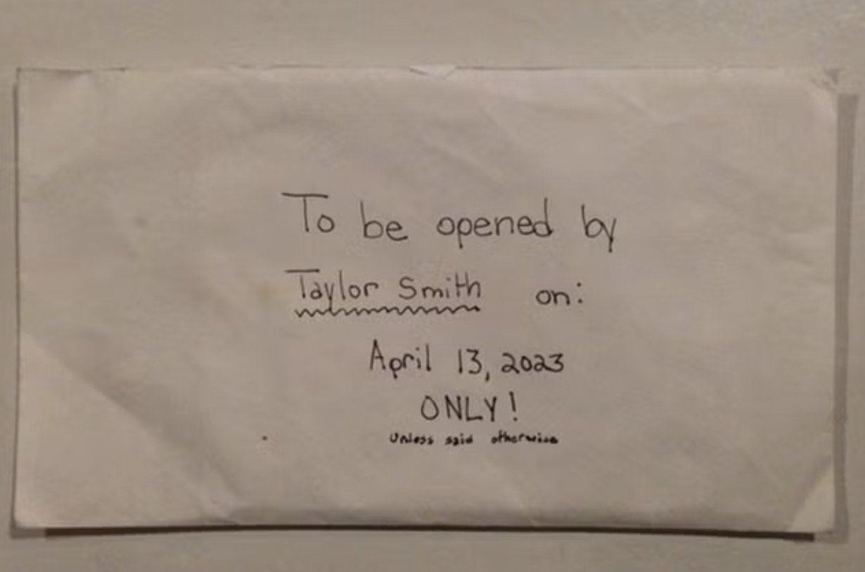 Mary Ellen and Tim Smith discovered the letter when sorting through their daughter’s boxes in her rooms. On the front of the envelope it read: “To be opened by Taylor Smith on April 13, 2023 only unless said otherwise.”