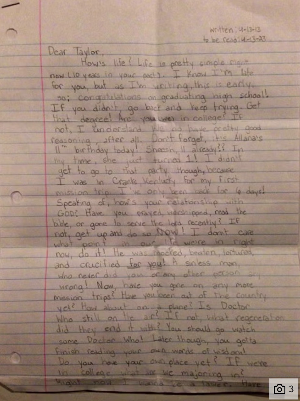 The letter begins: “Dear Taylor, How’s life? Life is pretty simple 10 years in your past.