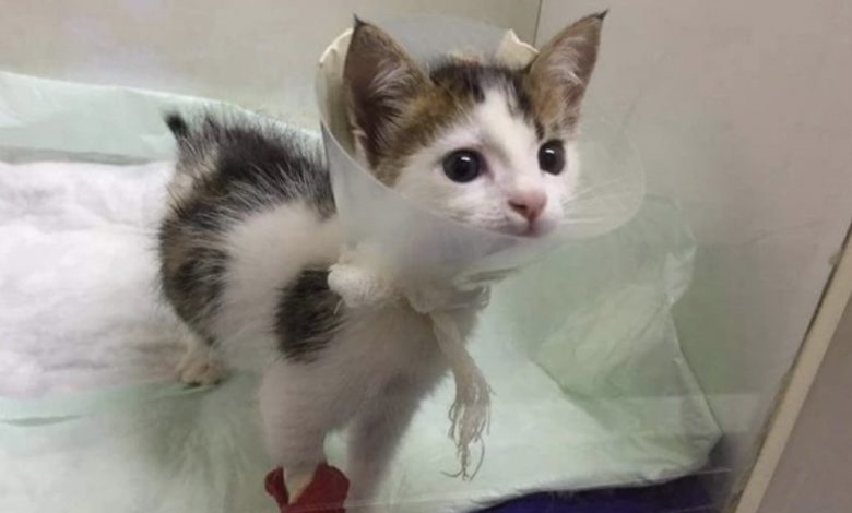 Clearly abandoned there, the kitten was suffering from a broken front leg in addition to gangrene in a back paw.