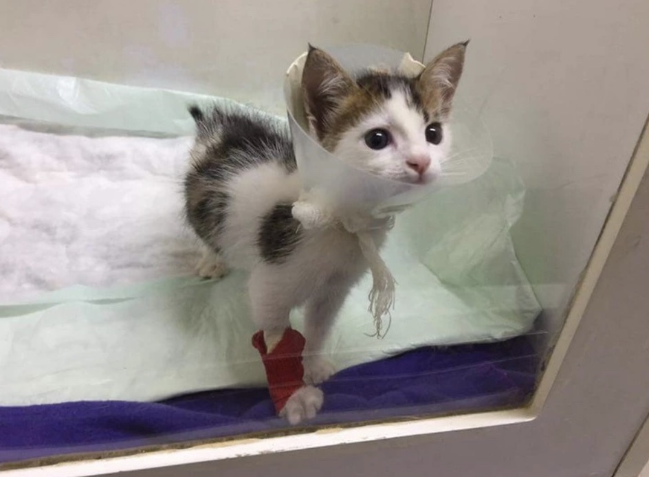 Clearly abandoned there, the kitten was suffering from a broken front leg in addition to gangrene in a back paw.