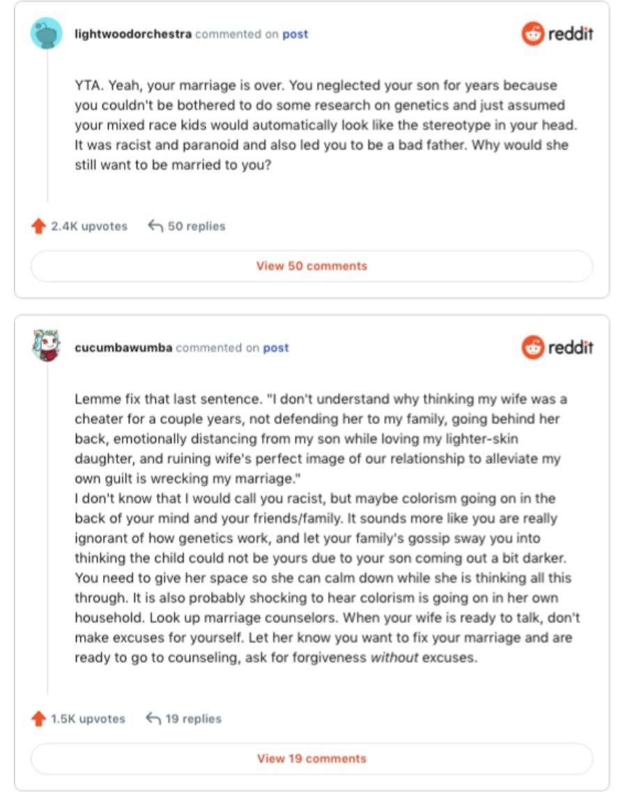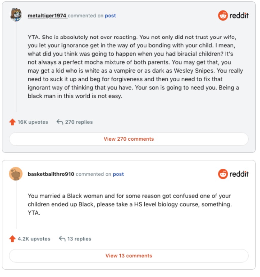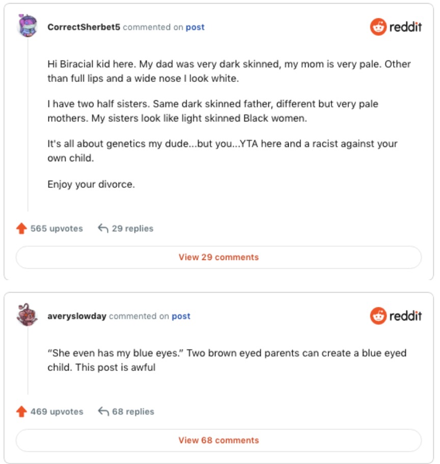 One Reddit user said the man’s wife wasn’t overreacting because her husband failed to trust her and let his “ignorance” prevent him from bonding with his son. The social media user asked the man what he thought would’ve happened when he had biracial children, as the offspring didn’t always come out mixed.