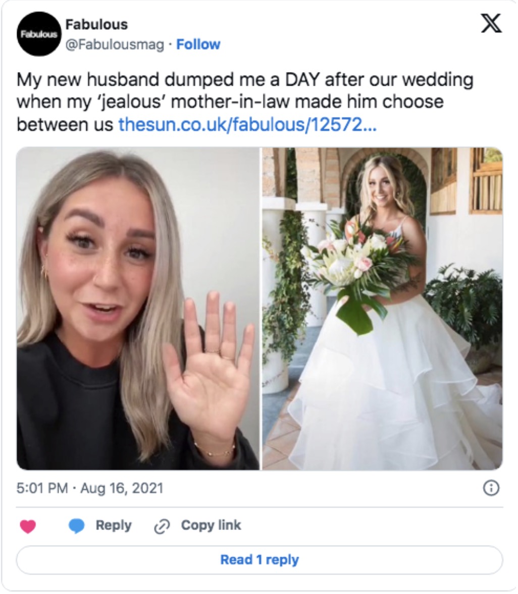 Jillian felt like she was living in a nightmare after her new husband uttered words no wife wanted to hear. In 2021, shortly after their wedding, he broke up with her because of his mother’s interference. The bride stated that her partner “took off his wedding ring and dumped [her] the day after the wedding.”