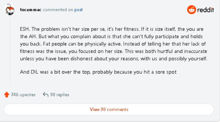One person advocated for Beth, saying the issue wasn’t her weight but her fitness. The commenter noted that she could be physically fit and still be overweight, and the woman needed to assess if she was upset by Beth’s weight or her fitness.