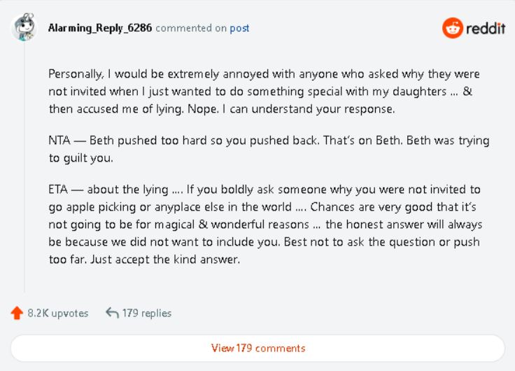 When the woman got the call from Beth to ask why she hadn’t been invited to the trip to the orchards, the woman lied and told Beth it was just a family trip. However, Beth called the woman out on her lying.