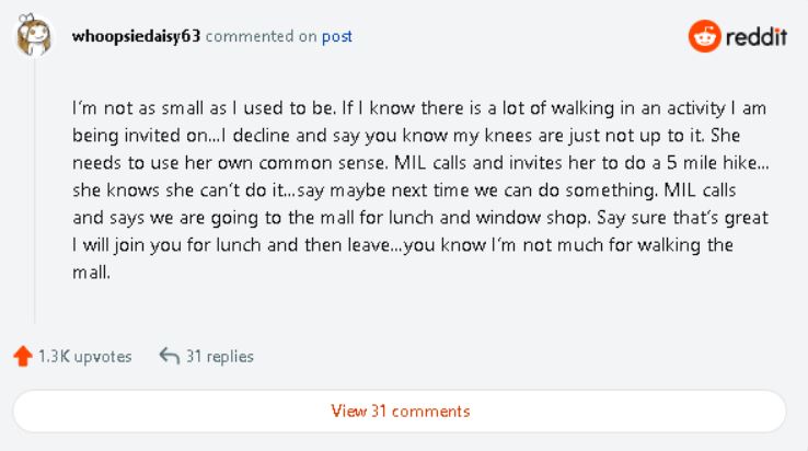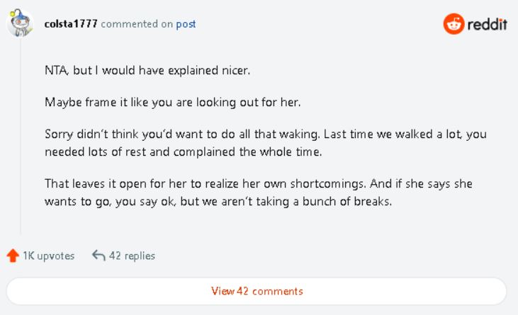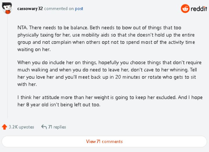 Another person said Beth should be okay with not being included in things that were too physically taxing for her or find something that helped her move with the group more easily. The person also hoped that when the woman included Beth, she would choose things that wouldn’t require too much physical fitness.