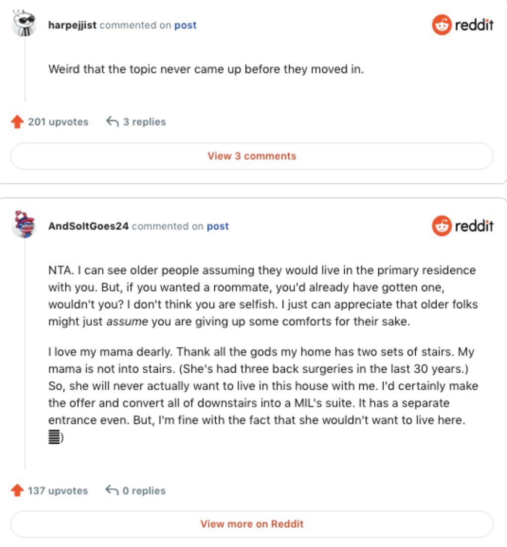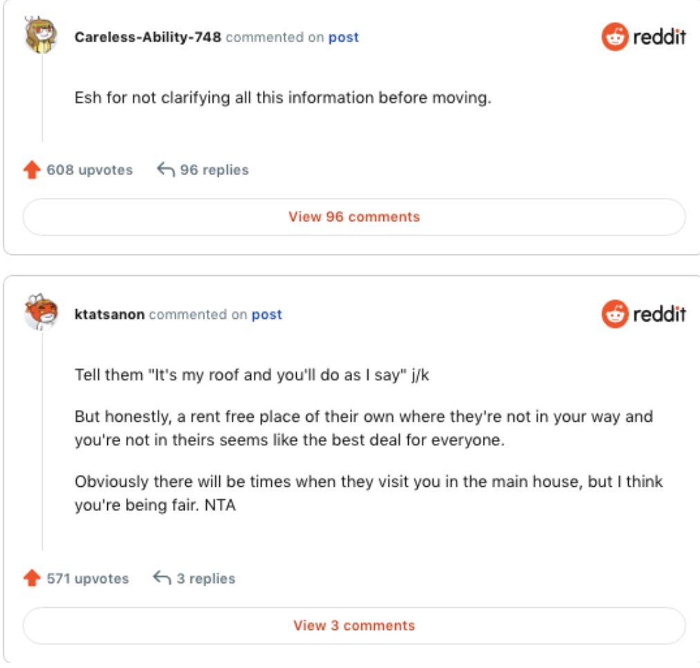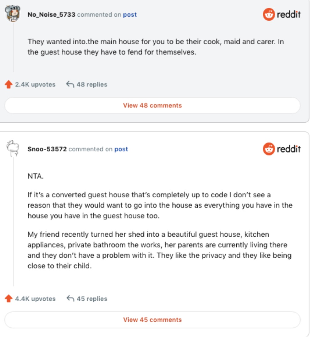 Another commenter thought the woman’s parents wanted to live in the main house so she could cook and clean for them rather than them having to do it for themselves. One user shared that her friend had done something similar for far more grateful parents, saying: