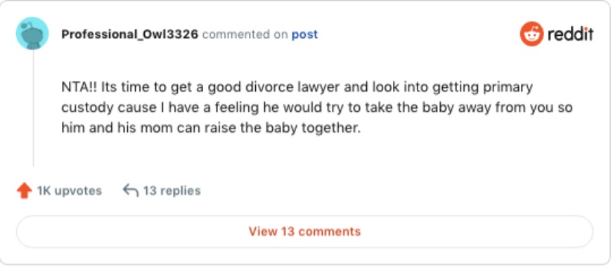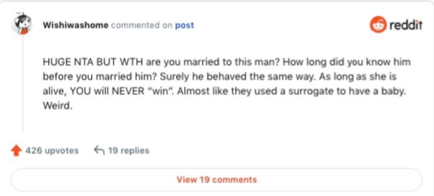 Her husband told her that being around more for her would eat into the time he had to spend with his mother. While the woman understood that concept, she explained that she needed him more than his mother did at that point, to which the husband replied: