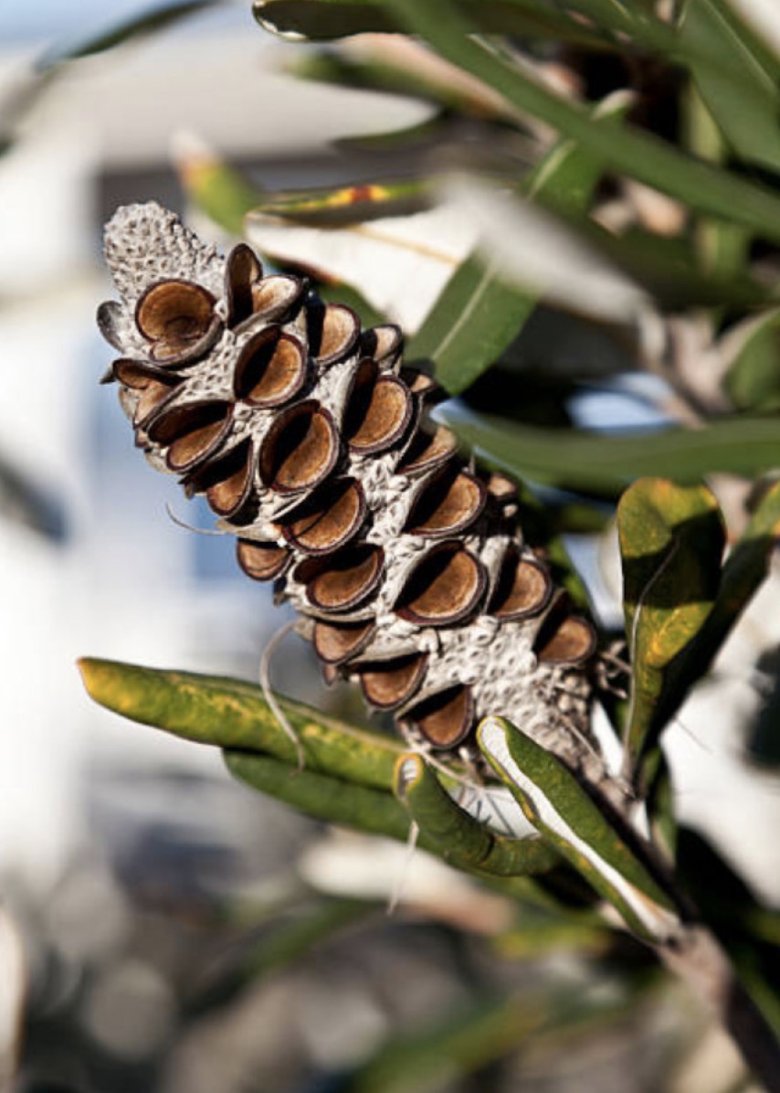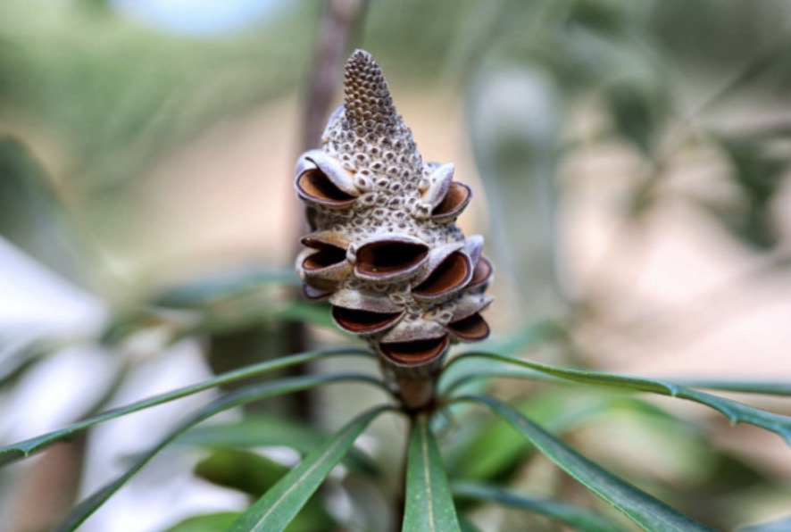 After the banksia’s beautiful red or yellow flowers fall off, the cone still grows on the tree.