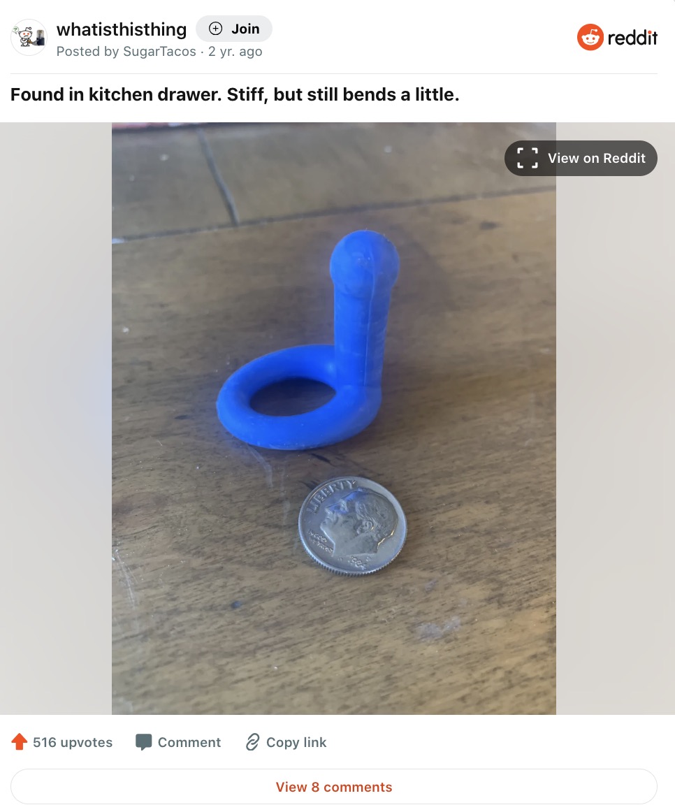 A user stumbled upon a small, yellow, phallic rubber item near their kitchen sink. Perplexed and slightly uncomfortable, they turned to Reddit for answers. The community quickly identified it as a keyring for certain measuring spoons or cups, bringing relief to the original poster.