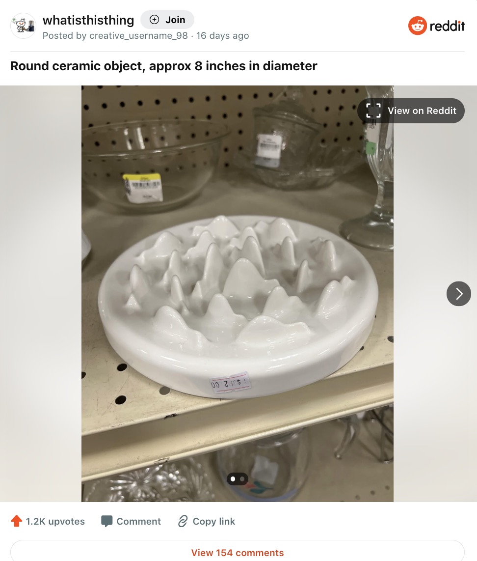 Exploring the aisles of a thrift store, a Reddit user found a ceramic or porcelain object with protruding shapes on a flat plate. After sharing the image, the community revealed it was a