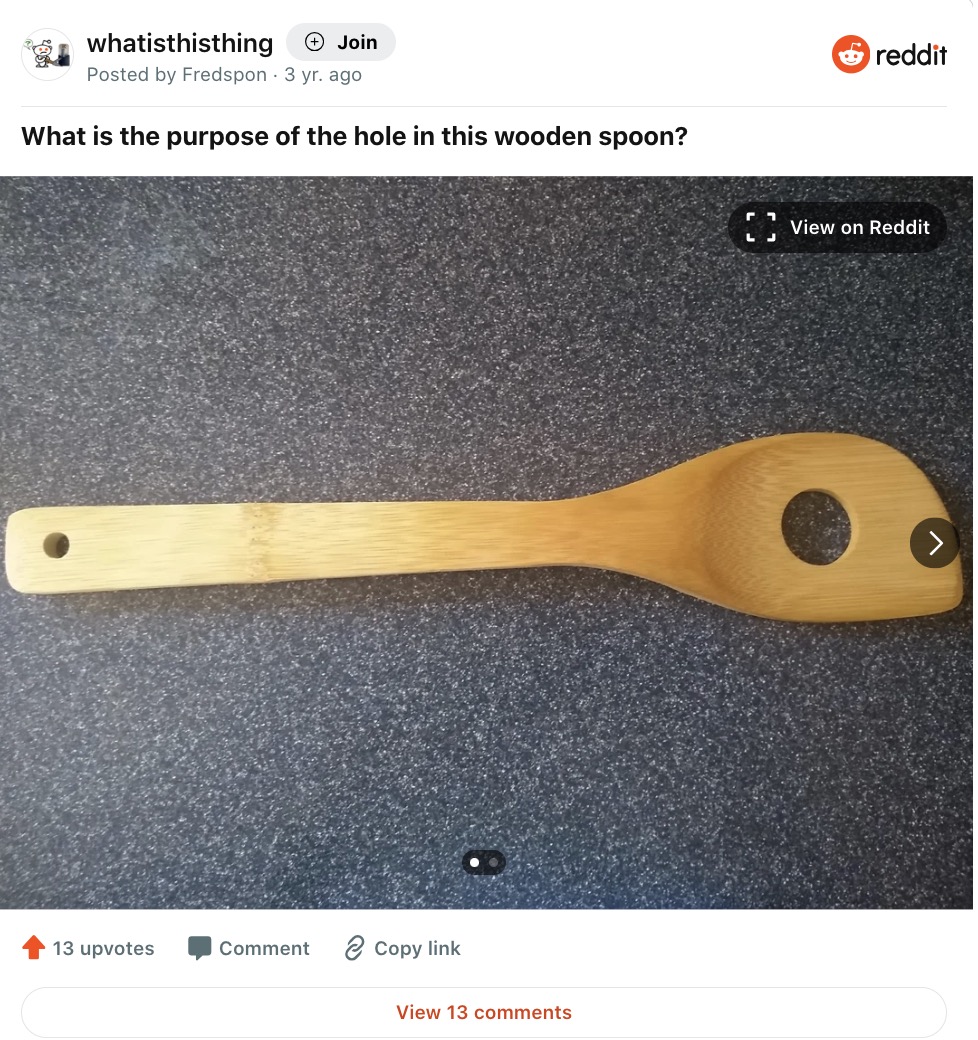 In the realm of kitchen utensils, a wooden spoon with a hole in the middle left one person puzzled. Reddit swiftly clarified that the design allowed liquid to flow through while stirring, and its specific purpose was for making risotto.
